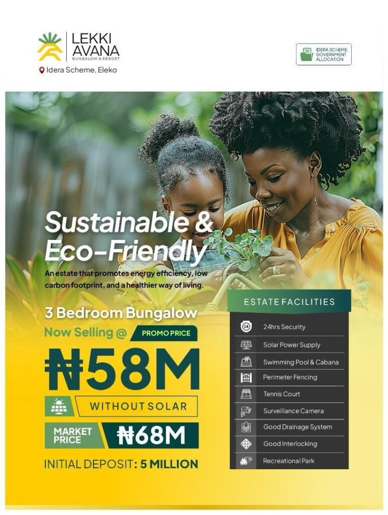 Experience the perfect blend of modern comfort and resort-style relaxation at Lekki Avana. Imagine waking up in a beautifully designed bungalow, surrounded by tranquility and luxury—without the constant hum of noisy generators. This is your chance to own a home in a secure, energy-efficient community built for ultimate comfort. Secure your spot today before prices rise!
